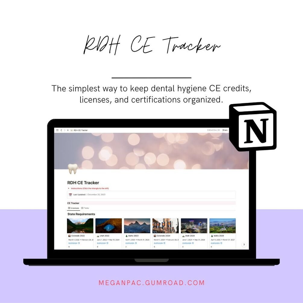 If you're a dental hygienist with multiple state licenses, you know how overwhelming it can be making sure that you keep track of license renewal periods and state CE requirements. This tool was made to organize your state licenses, CE, and certifications all in one convenient place. You can even set reminders ahead of when your license or certification is set to expire so you never miss a renewal again. Customize it with your different state licenses and each state's requirements, then log CE and apply it to each license's CE earning window to automatically calculate how many credits you've completed it. Mark individual CE courses with a tag to indicate if they meet a specific criteria, such as in-person, live, self-study, etc.